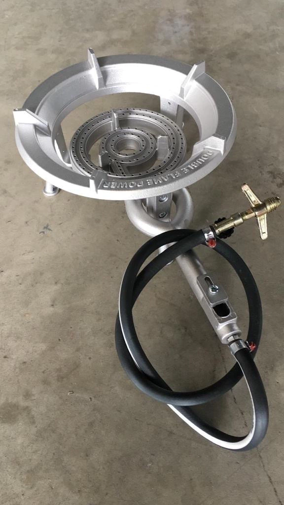 Fogareiro de Alumínio Fundido robusto com 2 chamas duplas cada com rosca para o botijão P13 e válvula de regulagem de controle de chamas única Double Flame Power com acabamento de qualidade superior. Acompanha um tripé que pode ser retirado para colocar o fogareiro em cima de bancadas ou até mesmo dentro da churrasqueira.